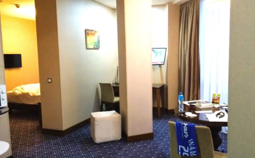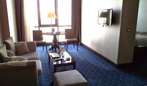 前回は角部屋でしたが、部屋に入るといきなり柱!部屋の真ん中にも、もう一本柱!壁に無理矢理取り付けられたテレビは、柱が邪魔で見る位置が限られてしまい、そのせいかソファーもない。ベッドにいる間以外は仕事しろ!という雰囲気でした。