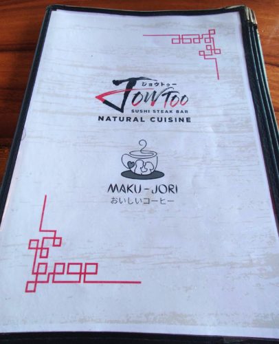 その日本食レストランの名前はアルファベットで ”JouToo”。カタカナでも『ジョウトゥー』と書いてある。店員に「店名の意味は?」と尋ねると、わからないという。別の日に、また別の店員に尋ねてみたが、オーナーしかわからないと言う。とすれば、タガログ語(フィリピンの公用語のひとつ)でも、イロカノ語(フィリピン北部の地域共通語)でもないので、おそらく日本語の「上等」ではなかろうかと推測できる。