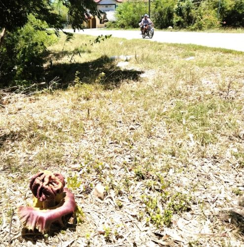 実はこれ、コンニャクの仲間で、東南アジアなどに分布している「ゾウコンニャク」です。開花と同時に腐肉臭を放ち、ハエなどをおびき寄せて受粉させるそうです。球茎に炭水化物が含まれるため、食物として各地に広がっていったよう。