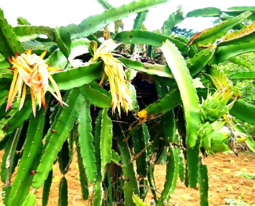 写真の左側にあるような花が咲き、右側にあるような実になっていきます。この花だけを見ても、ドラゴンフルーツだとわからない人が多いかもしれませんね。