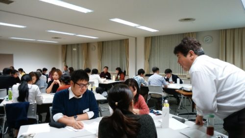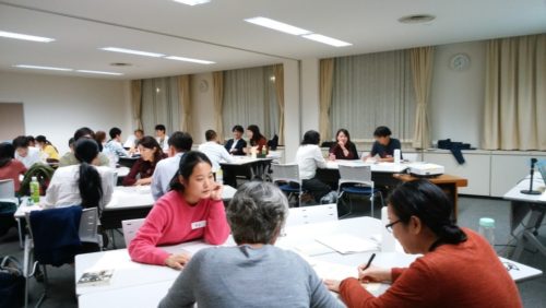 そして、日本女子体育大学の影山陽子准教授による講義のあと、参加者は、グループでのワークを行いました。実際に「やさしい日本語」を使って『身近で災害が起きたら、そばにいる外国人に何をどう伝えるか』というタスクを遂行するため、活発な意見が飛び交いました。