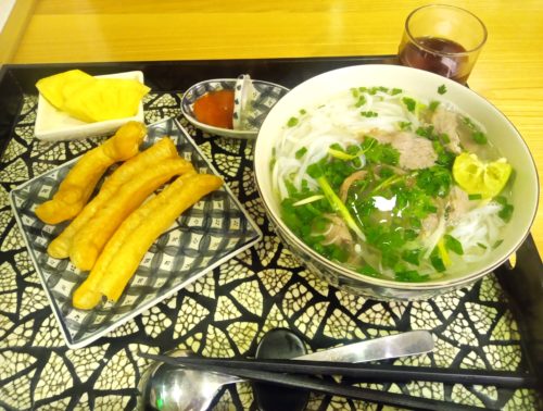 やはり、まずはこれ、フォー。揚げパンや果物がセットになっていて、満ち足りた気持ちになりました。