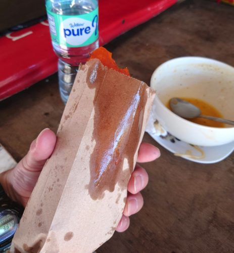 ミキを平らげ一息ついたところに襲い掛かってきた感があり、入っていた紙袋の裏を見ると、紙に油が染み込み、滴っていた。